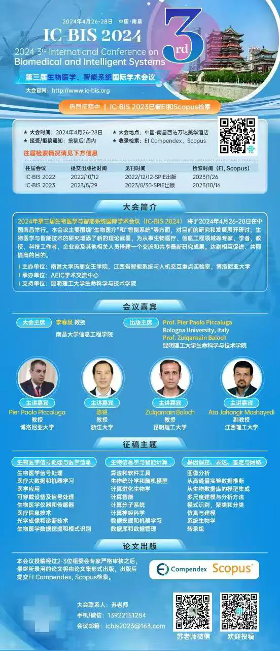 第三届生物医学与智能系统国际学术会议(IC-BIS 2024)将于2024年4月26日至28日在中国南昌举行。本次会议围绕“生物医学”和“智能系统”主题,汇聚全球生物医学、智能技术领域的专家、学者和行业人士,深入探讨当前研究热点,促进跨学科合作,推动这些领域的最新进展。